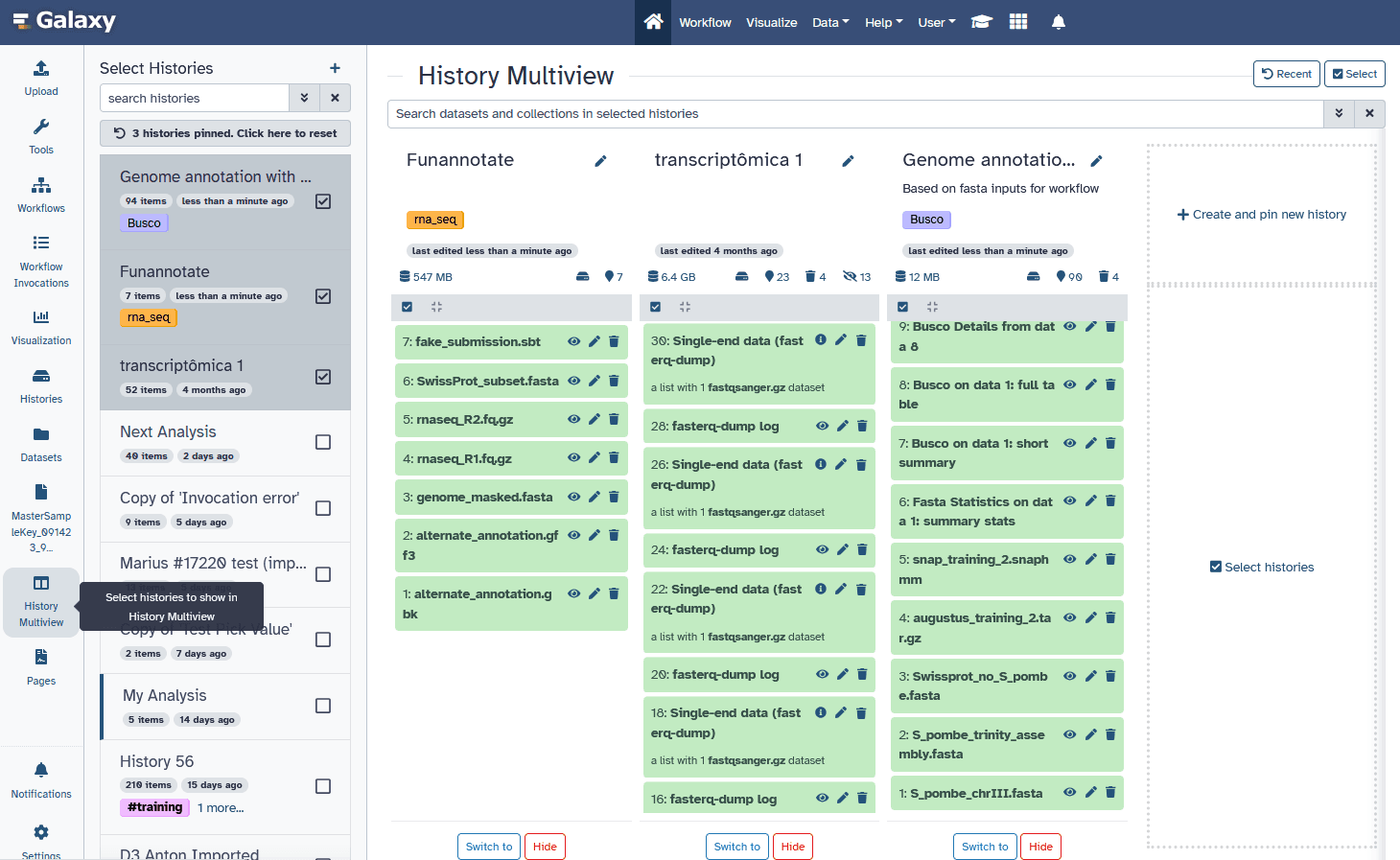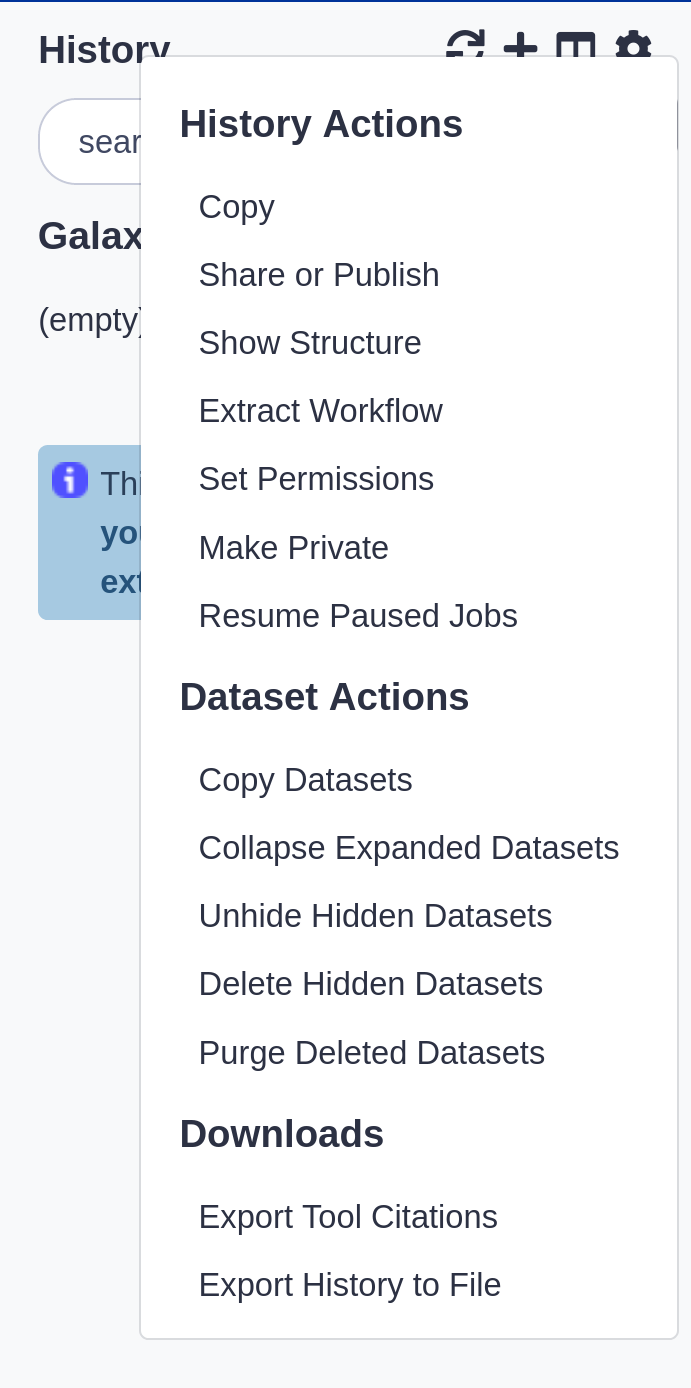 - Download shared data from public libraries or shared Data libraries, Histories, Workflows, Visualizations, and Pages on https://usegalaxy.org/