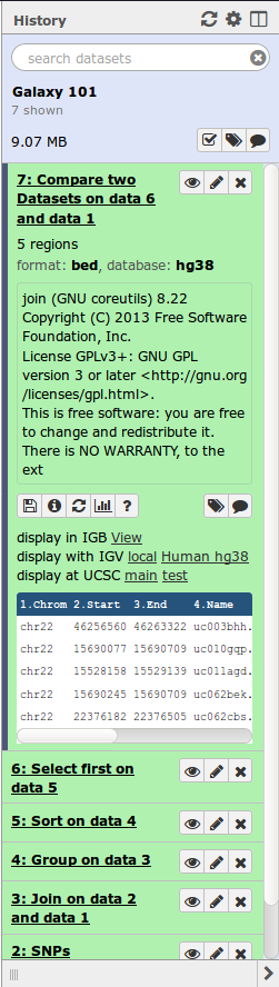 For each dataset (the heart of Galaxy’s reproducibility), the history tracks