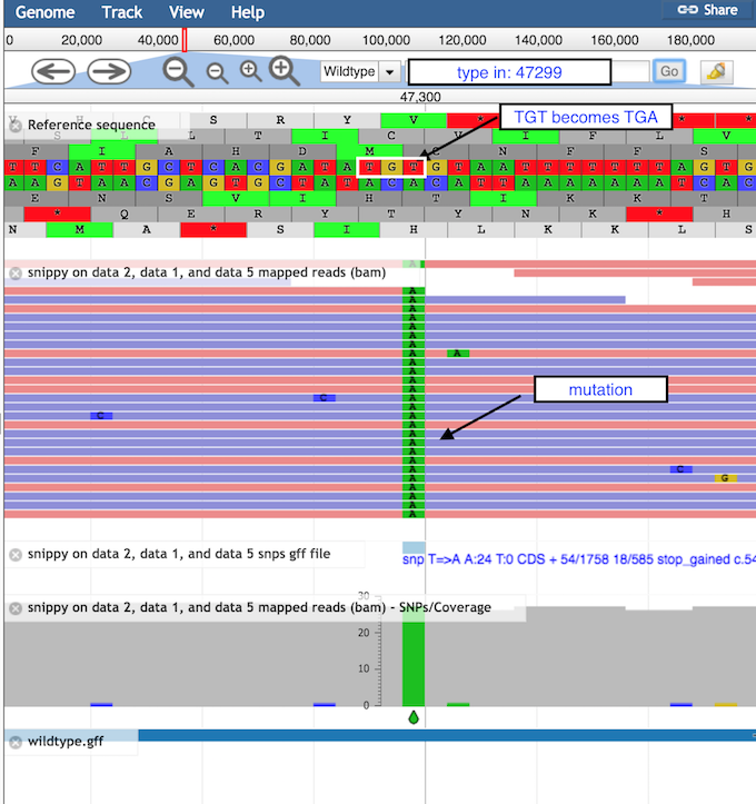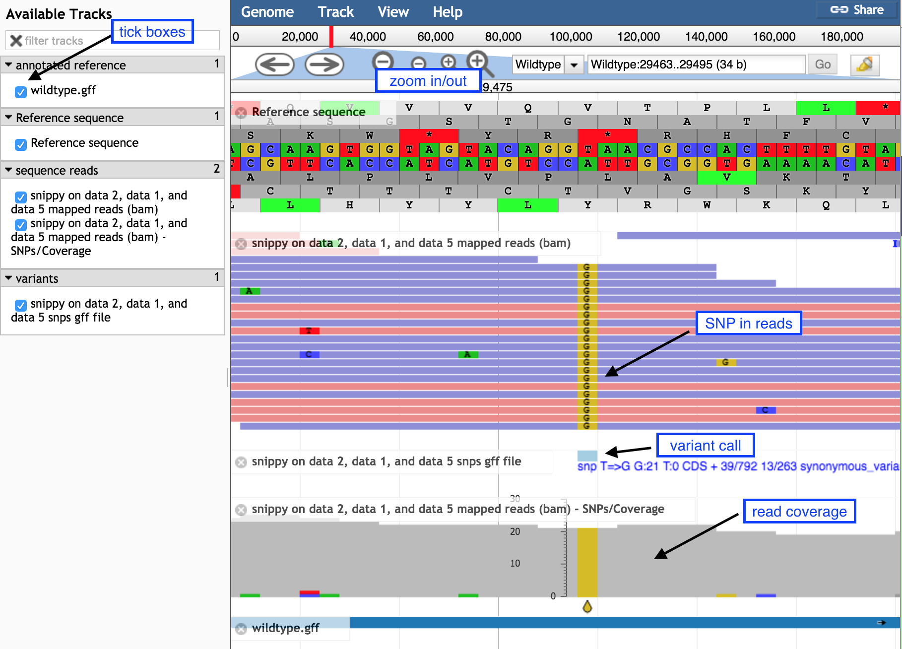 SnippySnippyminus button to see sequence reads and their coverage (the grey graph)plus button to see