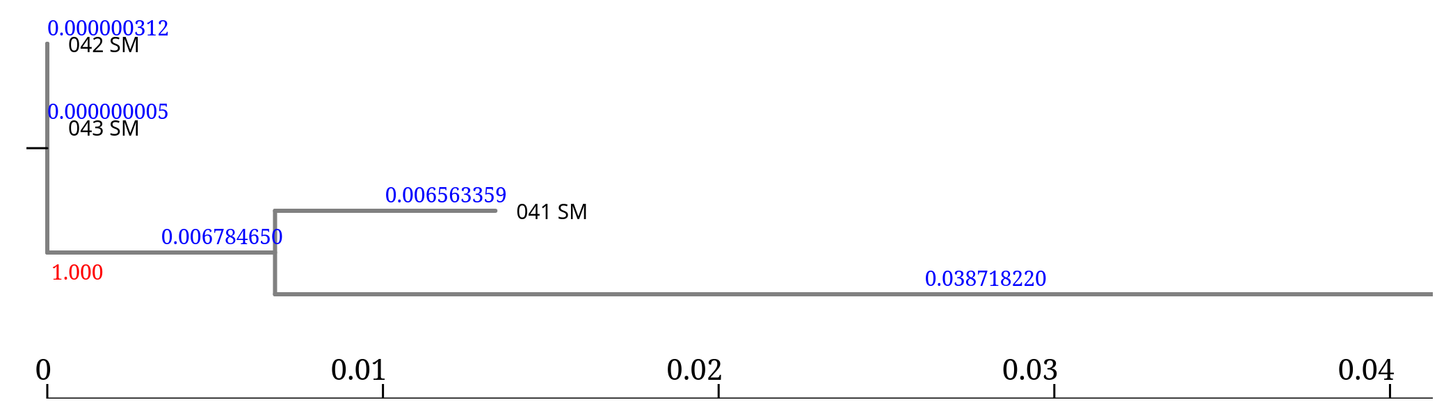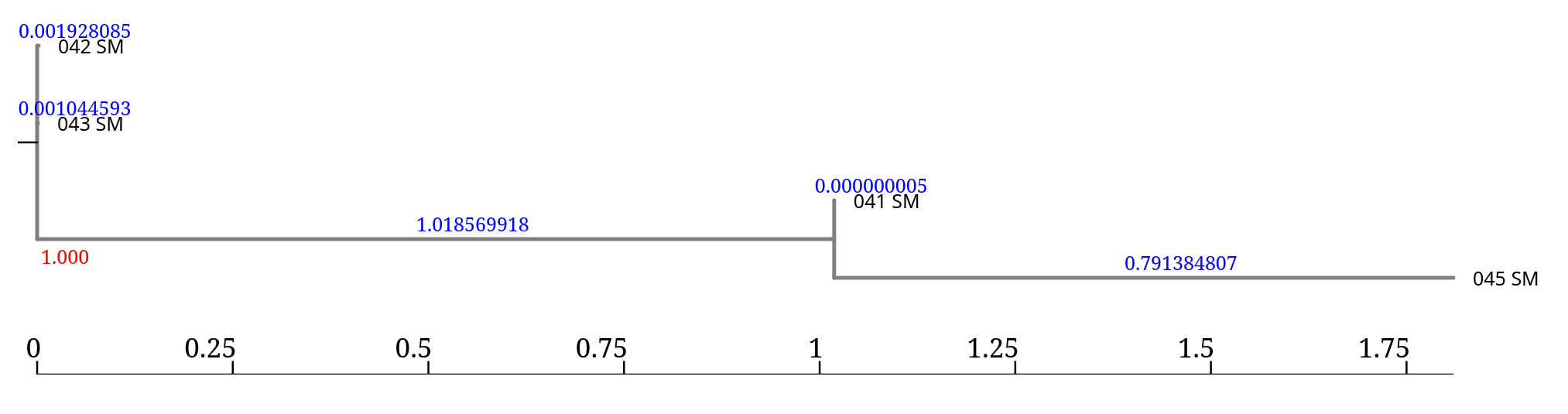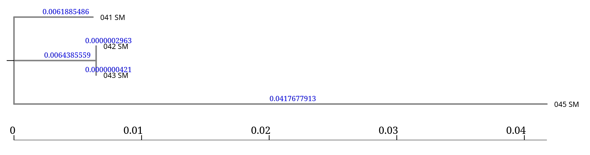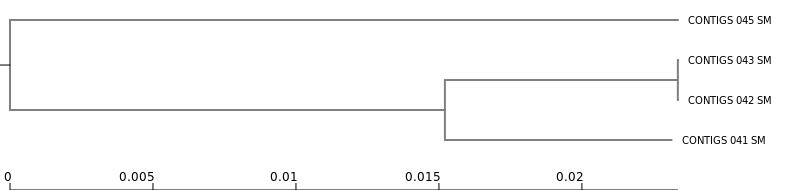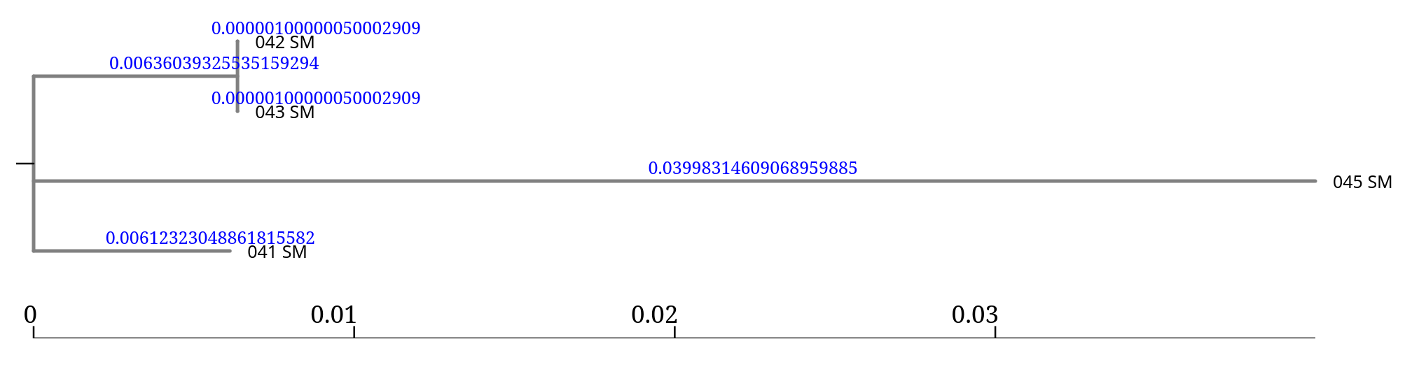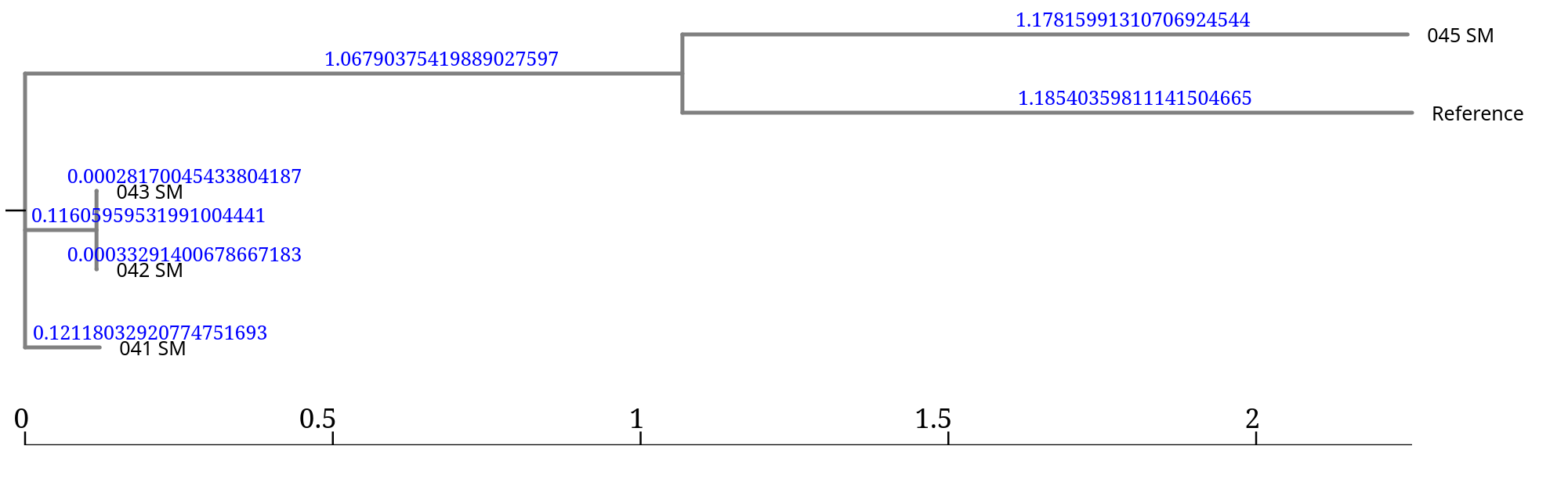 In this tree, the branch lengths associated with 045_SM and the reference are much larger, suggesting that this isolate is much more divergent from the other samples.