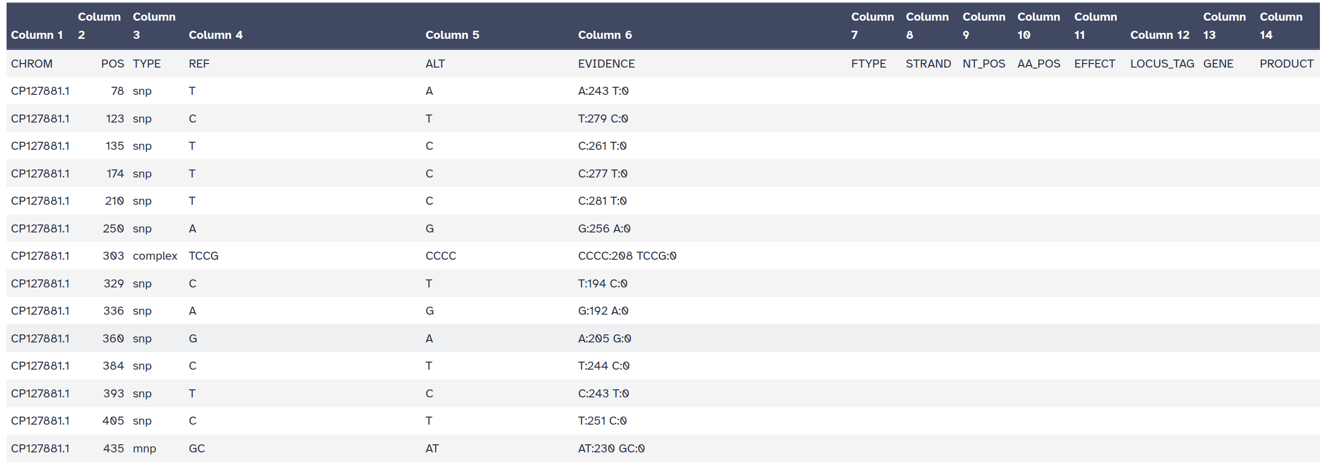 snps table: A simple tab-separated summary of all the variants