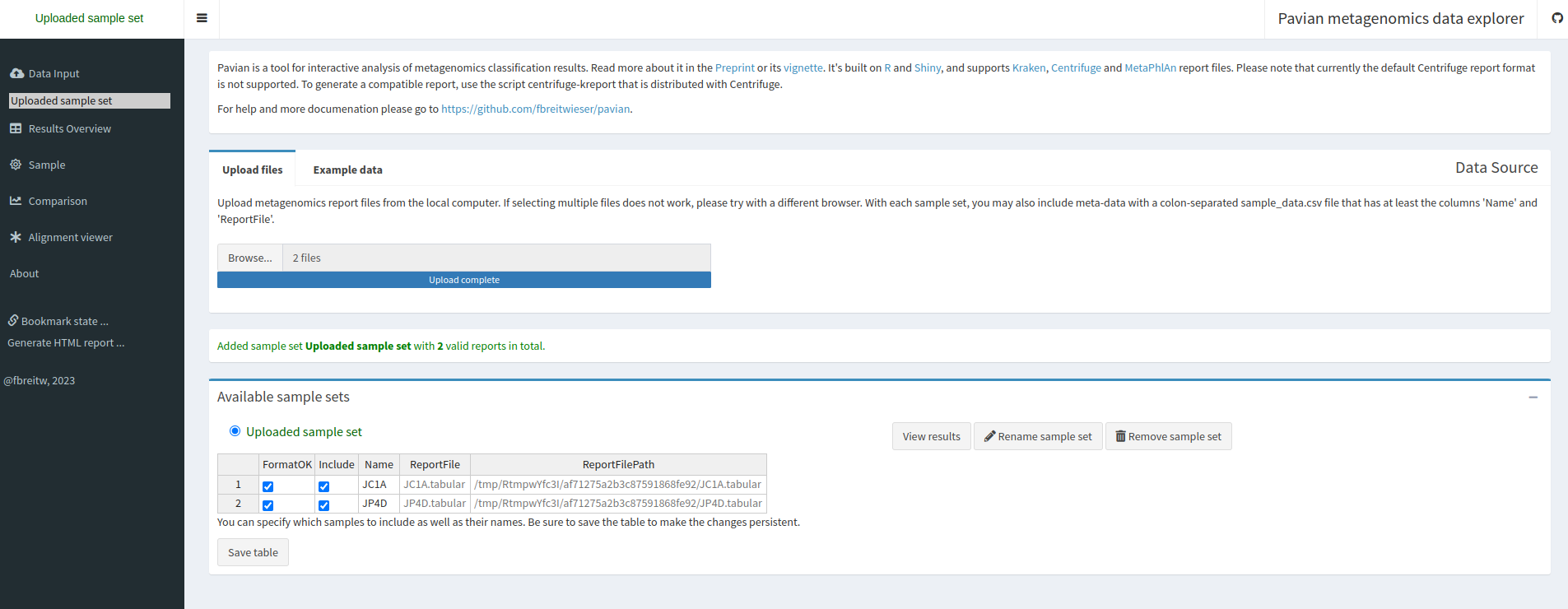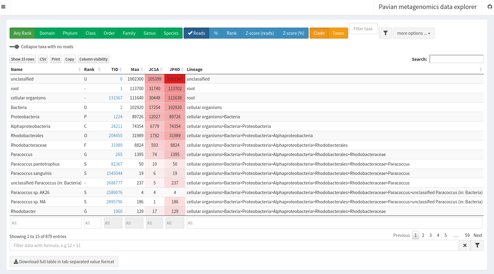 Proceed to gallery to see an overview of all visualization optionsPavian (pathogen visualization and more) is an interactive visualization tool for metagenomic data. It was developed for the clinical metagenomic problem to find a disease-causing pathogen in a patient sample, but it is useful to analyze and visualize any kind of metagenomics data.