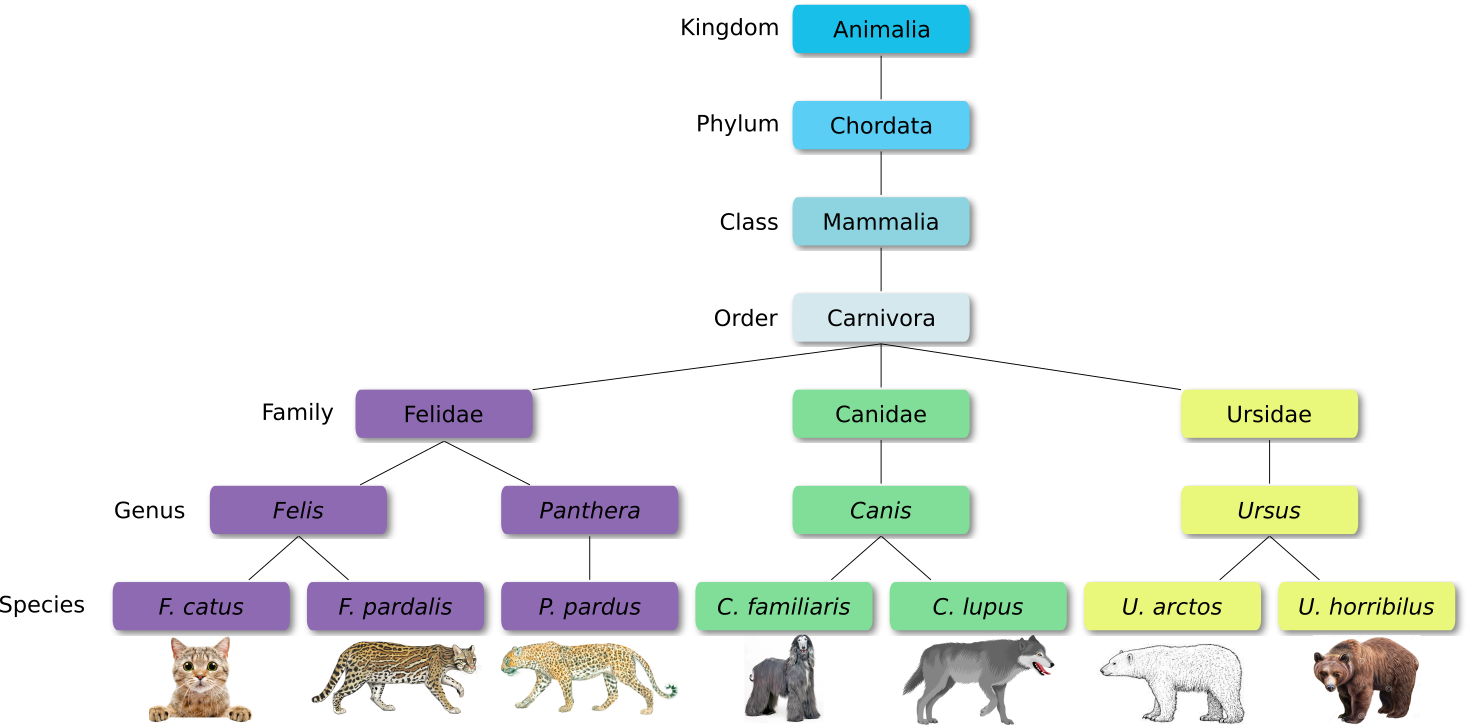 The taxonomic hierarchy includes eight levels: Domain, Kingdom, Phylum, Class, Order, Family, Genus and Species.